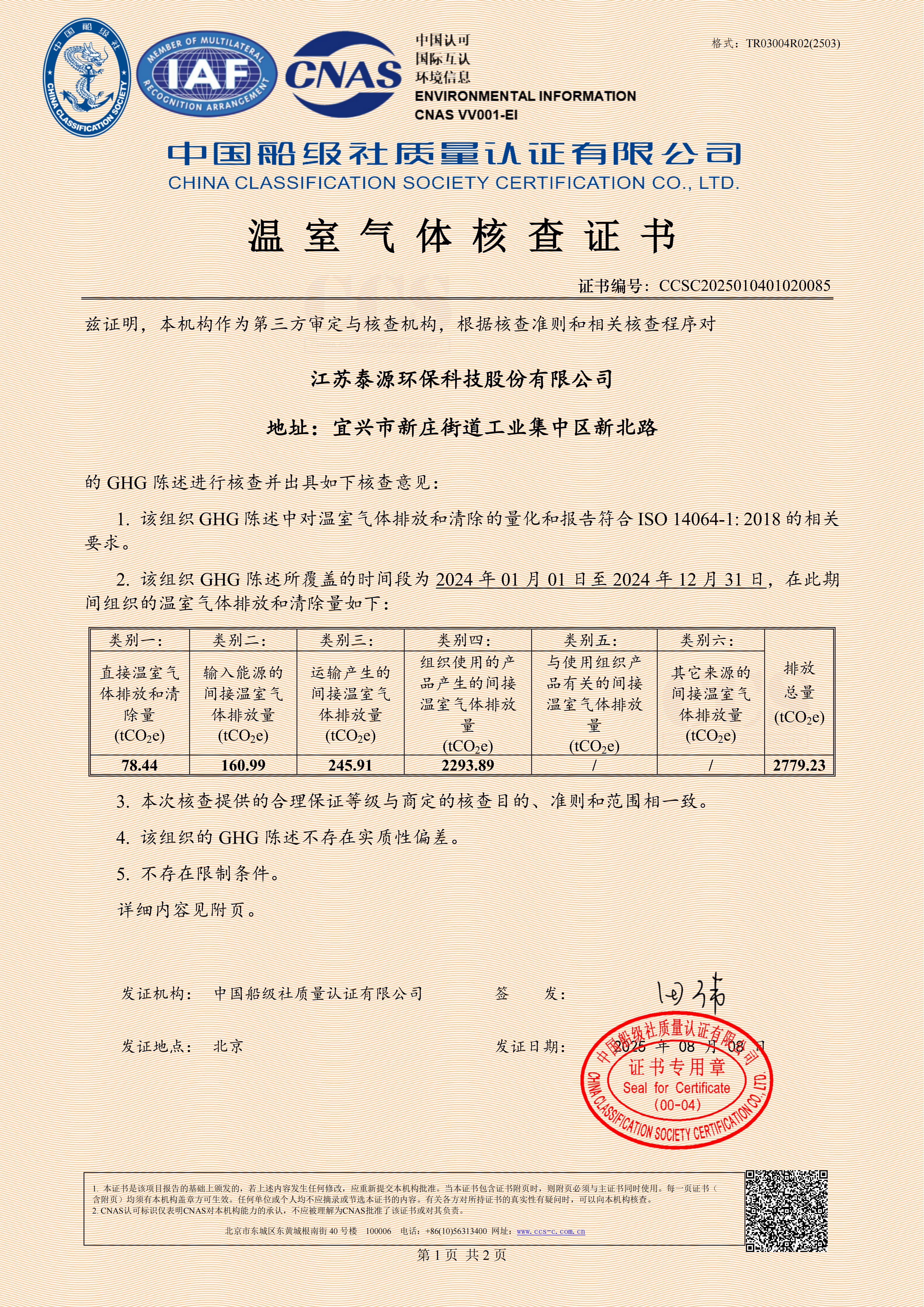 江苏泰源环保科技股份有限公司2024年度温室气体排放核查
