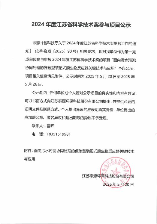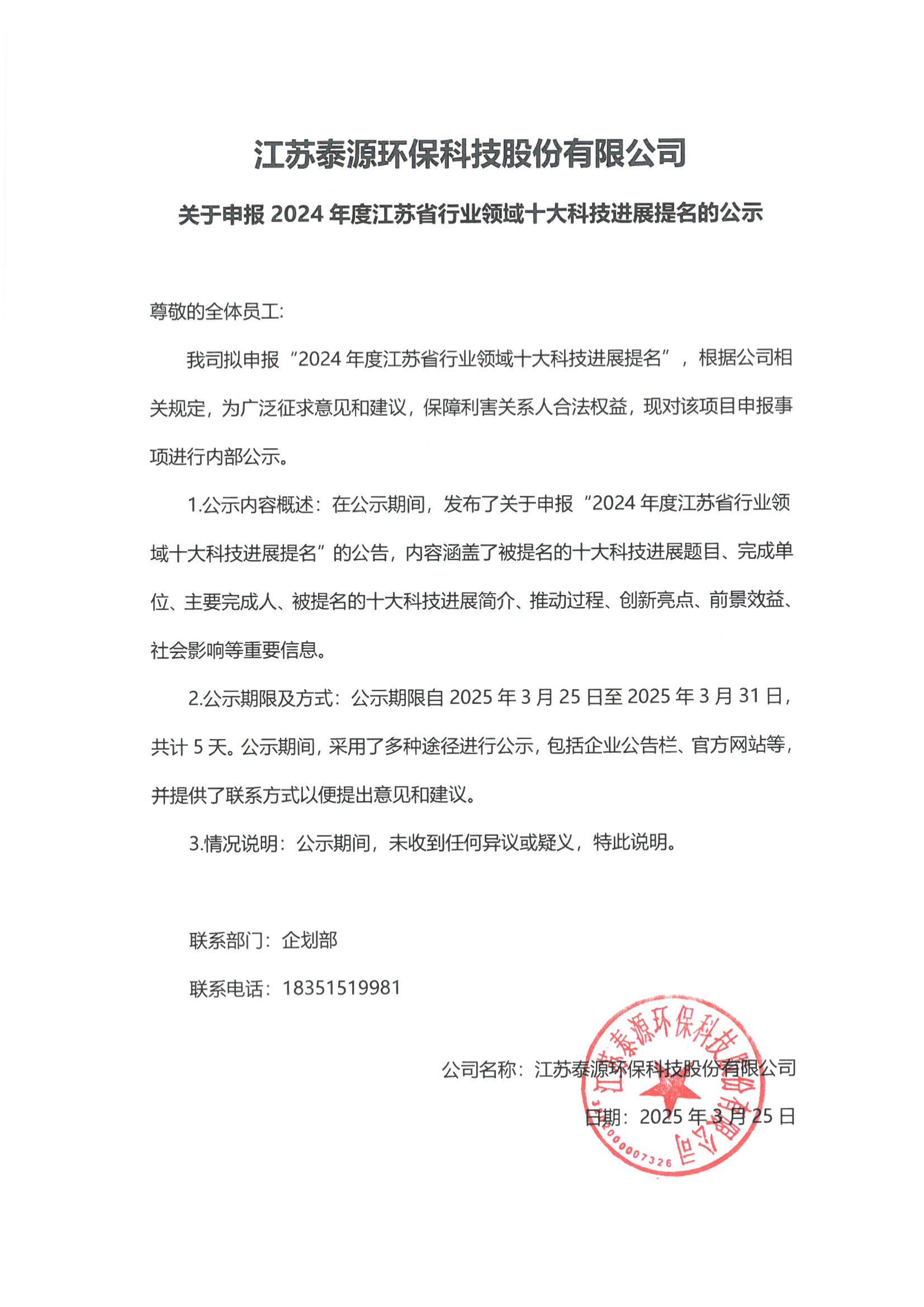 江苏泰源环保科技股份有限公司 关于申报2024年度江苏省行业领域十大科技进展提名的公示