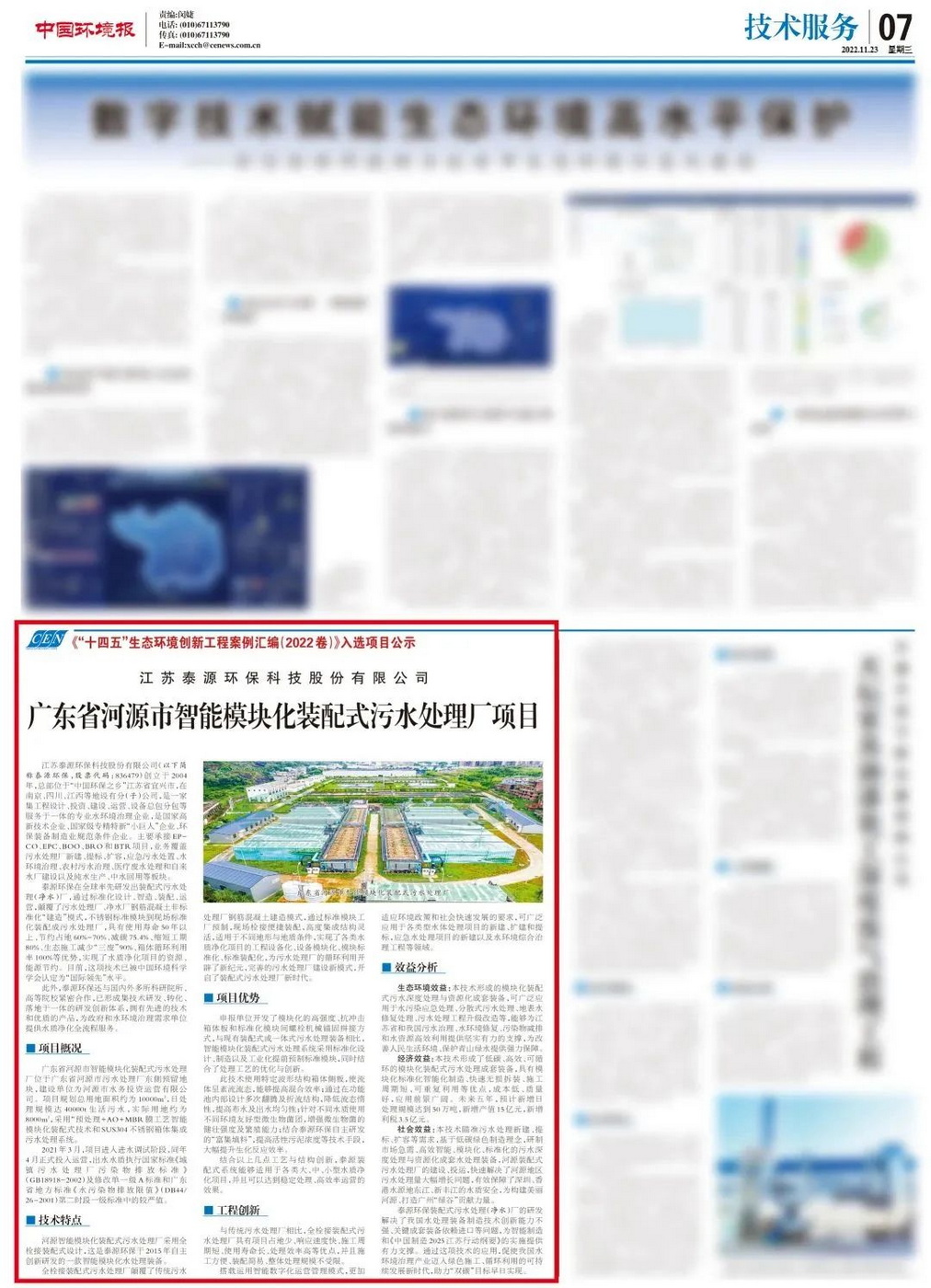 专精技术 专业认可 泰源装配式污水厂项目入选“十四五”生态环境创新工程案例